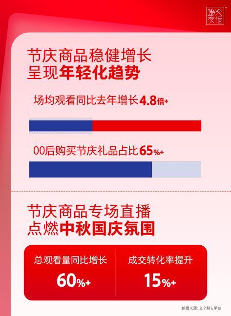 作为中秋国庆档的 “国民级食材”,大闸蟹持续热销,成为最吸睛的大爆款,交个朋友直播间推出多个大闸蟹专场,在直播间通过溯源展示、现场烹饪、口感评测等互动环节,点燃中秋节庆氛围,场均观看同比去年增长4.8倍。其中,00后在整个节庆礼品购买占比达到65%,年轻人正在通过直播电商成为节庆消费的主力军。