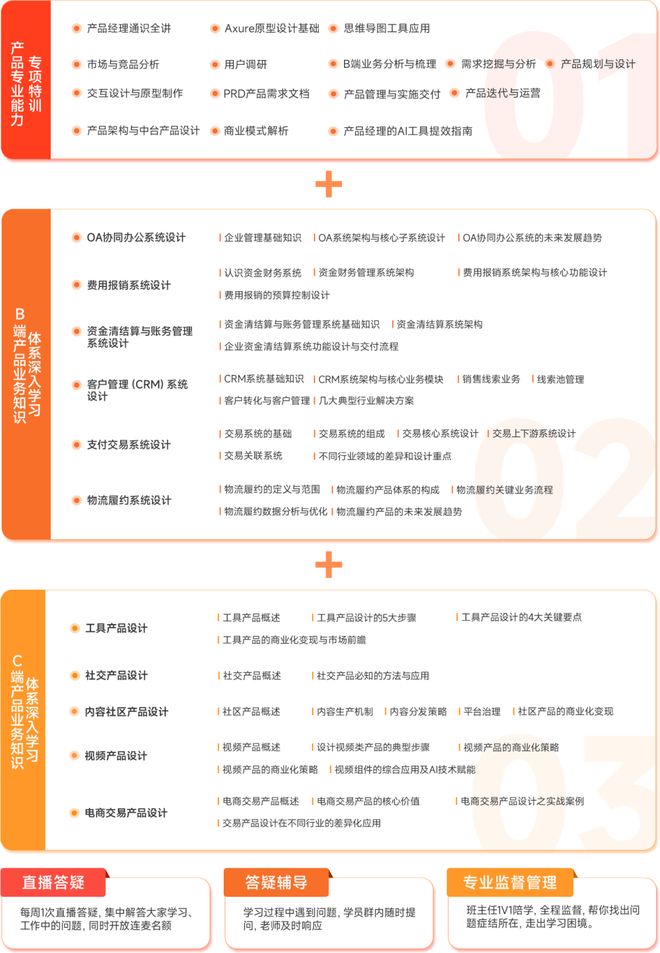除了底层能力的传授之外,课程拓展了11大方向的BC端业务知识板块,适应企业BC端业务同步发展需求。