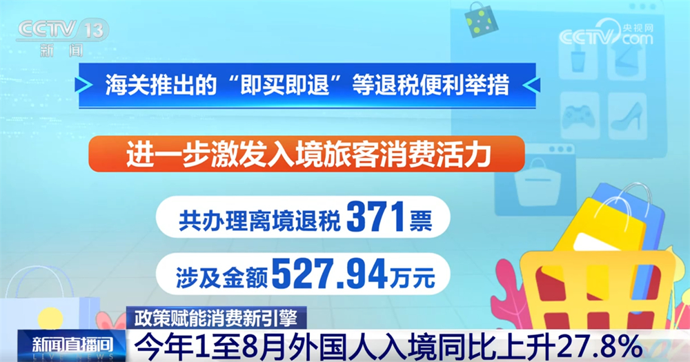 据统计,今年1至8月,外国人入境5126.8万人次、同比上升27.8%。我国服务零售额同比增长5.1%。数字消费、绿色消费、健康消费等新型消费持续壮大,入境消费持续扩大。截至8月底,全国离境退税商店数量突破1万家,前8个月退税商品销售额同比增长97.5%,享受退税人数同比增长2.5倍。